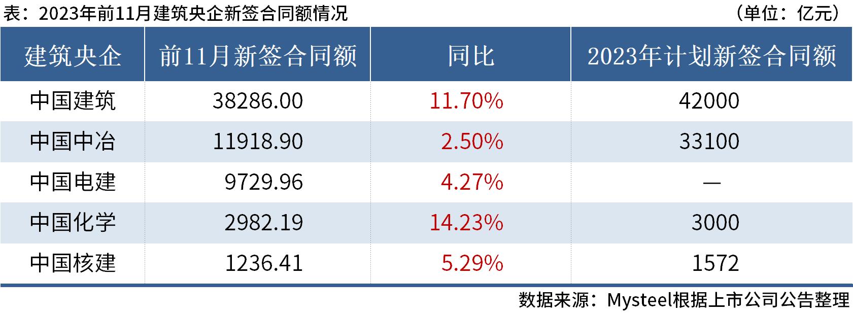 據Mysteel不完全統計,截至12月20日,共有5家建筑央企公布其1-11月新簽合同額情況,合計新簽合同額約64153.46億元,較去年同期(59013.81億元)增長8.71%。