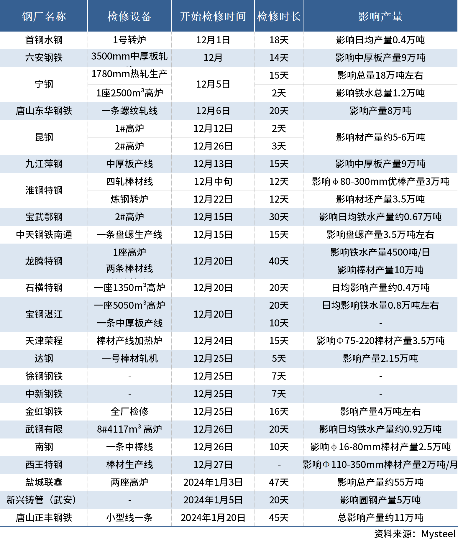 據(jù)Mysteel不完全統(tǒng)計,截至12月27日,國內(nèi)23家鋼廠發(fā)布檢修信息。其中,金虹鋼鐵計劃于2023年12月25日-2024年1月9日起全廠檢修,為期16天,預(yù)計影響產(chǎn)量4萬噸左右。
