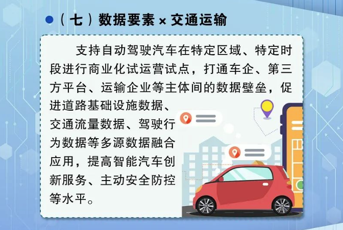 《“數據要素x"三年行動計劃(2024-2026年) 》提出,推進智能網聯汽車創新發展,支持自動駕駛汽車在特定區域、特定時段進行商業化試運營試點,打通車企、第三方平臺、運輸企業等主體間的數據壁壘,促進道路基礎設施數據、交通流量數據、駕駛行為數據等多源數據融合應用,提高智能汽車創新服務、主動安全防控等水平。