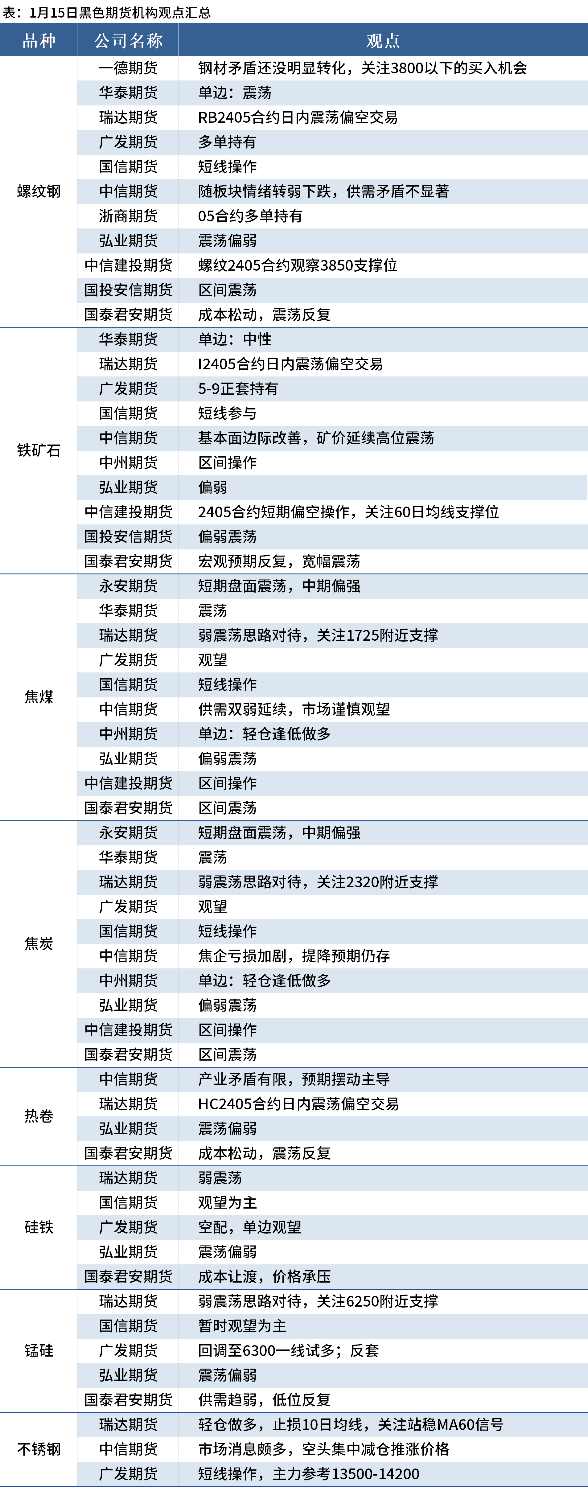 據(jù)Mysteel統(tǒng)計1月15日12家期貨機構(gòu)操作策略,其中多數(shù)機構(gòu)料螺紋鋼震蕩運行,鐵礦石震蕩偏弱,焦煤、焦炭震蕩運行。具體匯總內(nèi)容如下: