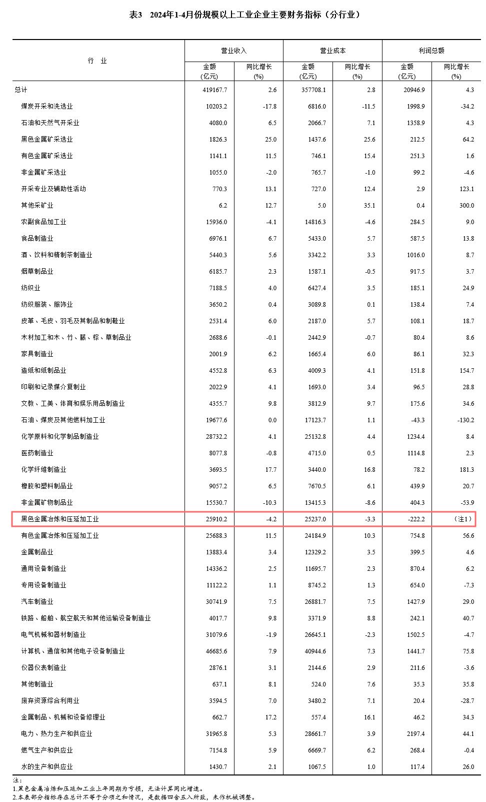 1-4月份,黑色金屬冶煉和壓延加工業利潤總額-222.2億元。