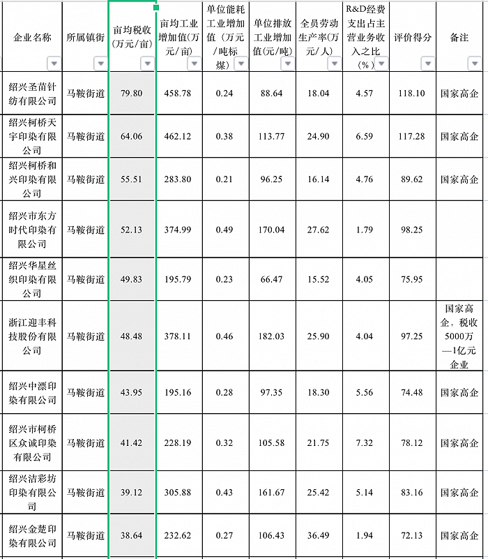2019年柯橋區工業企業畝均效益評定結果。信息來源:柯橋區人民政府